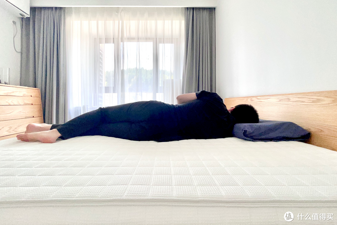 侧卧时,影响舒适度的主要因素是床垫对于肩部和胯部的包裹与支撑之间的平衡,良好支撑的同时不会过度给这两个部位带来过分压力是前提,裸感π厚实的填充层让肩部和胯部感觉被充分的包裹。