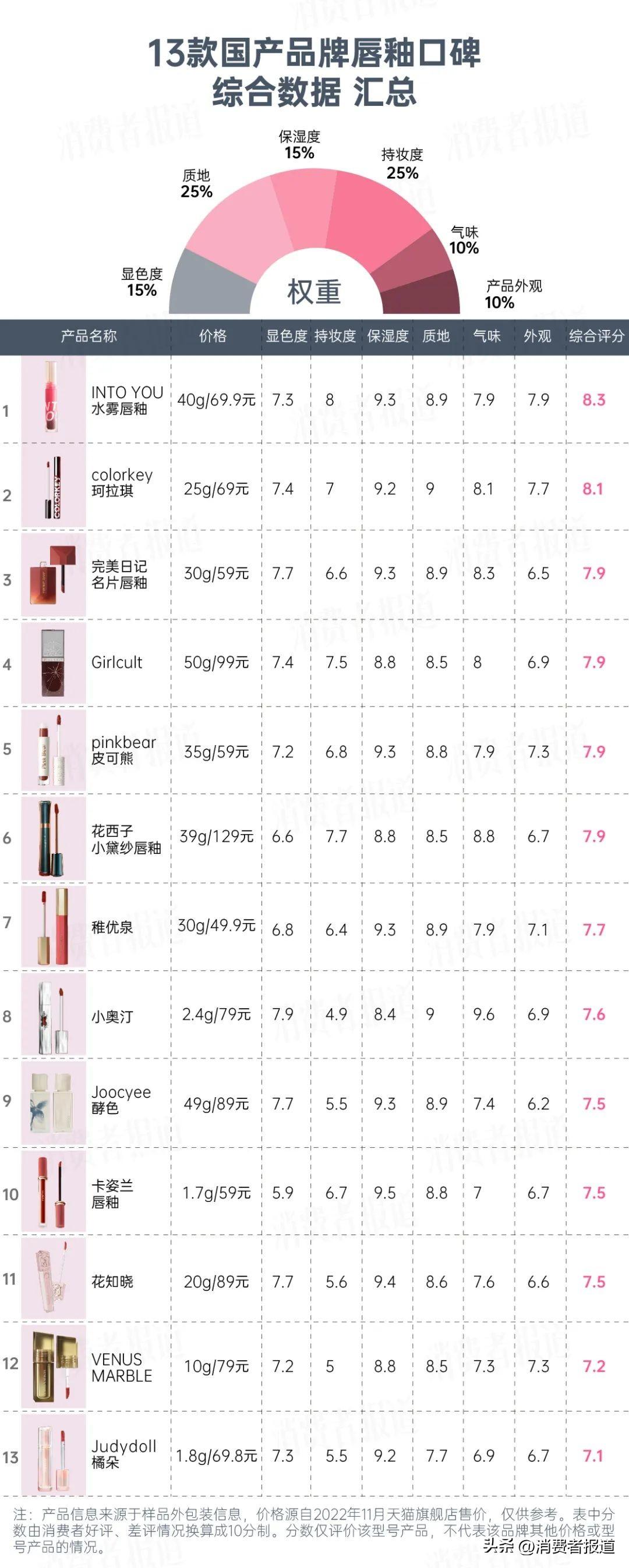 口碑情况口碑结果显示,13款热销海外唇釉中评分不分伯仲,各有出彩点。消道长根据以上6个维度评价指标选出了表现较好的前2款唇釉分别是:INTO YOU水雾唇釉 8.3分 、colorkey珂拉琪 8.1分;而总评分低的两款是:Judydoll橘朵 7.1分、VENUS MARBLE 7.2分。
