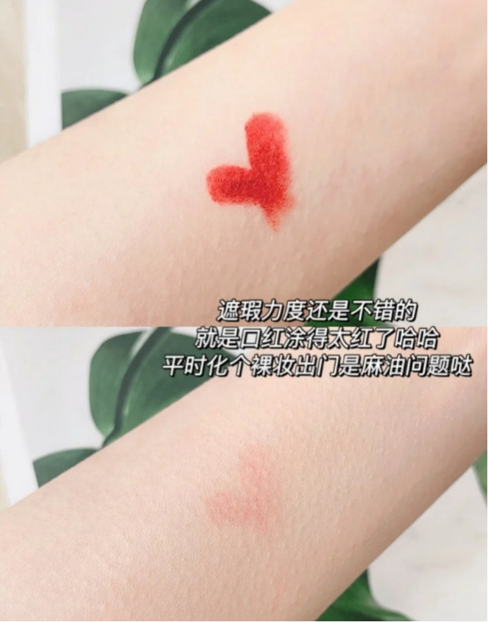 先来说它的质地,细腻好推开,而且持妆蛮好的,对于我来说不是很油,反而能缓解底妆带来的卡粉等尴尬情况,但如果是油皮的话,会稍微有点油,也不会很过分的那种,一点不厚重,上妆是很轻薄自然的感觉,所以自然遮瑕就会比较一般。