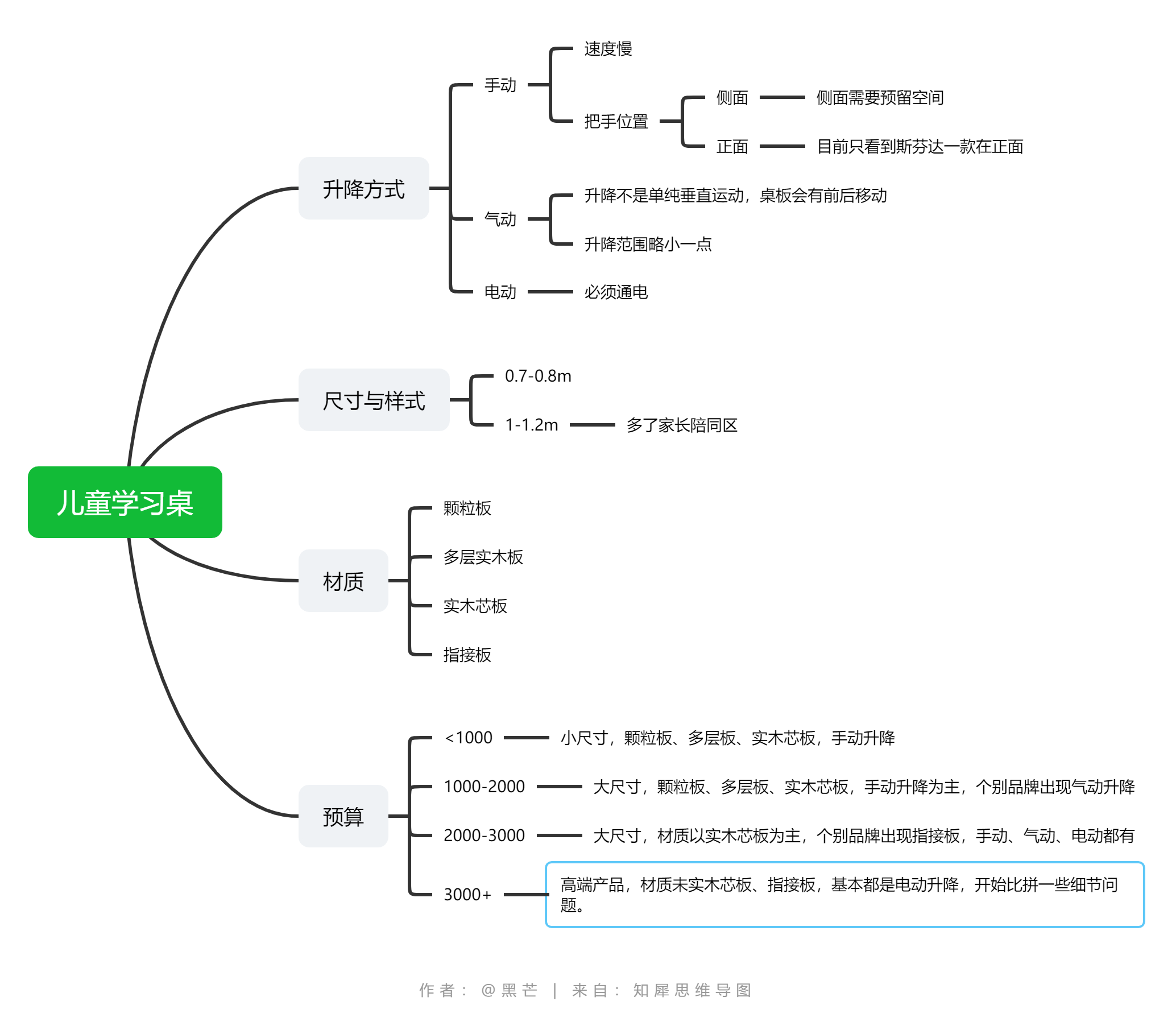 个人想法,在升降方式的选择上,如果抛开预算不谈,光从用途考虑,应考虑桌子是孩子专用还是家长混用。孩子专用的话,孩子虽说长得快,但是桌子高度一两年变化一次足够了,手动即可。如果是家长混用,考虑舒适度问题,可能就要频繁升降了,那么需要电动/气动。