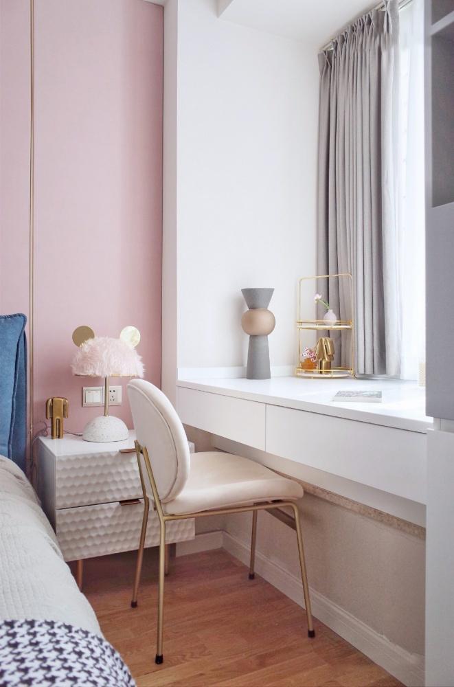梳妆台与飘窗连接,形成一个独立的空间,既可以充分利用房间的每一寸面积,又能满足摆放梳妆台的需求,节省空间,适合小户型的房间,具体做法是在原来的飘窗的基础上定制柜子,抬高并且桌面往外延伸一点,方便放脚。