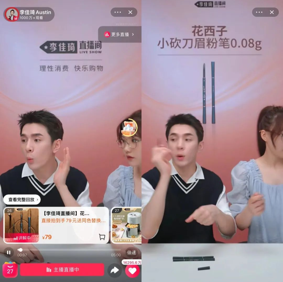 它2020年曾77次进入李佳琦直播间,但去年开始加强店铺自播。不过,花西子眉笔依然出现在了李佳琦920复播的直播间当中。
