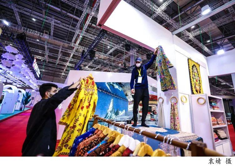 ▲克什米尔手工工艺品展位工作人员正在进行后的布展陈设。