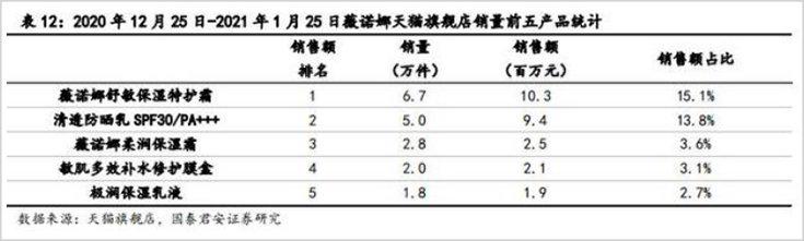 薇诺娜的产品中除了明星产品舒敏保湿特护霜之外,品牌陆续推出的 “清透防晒乳”、“舒敏保湿修护精华液”、“舒缓修护冻干面膜”等皆成为热门单品。