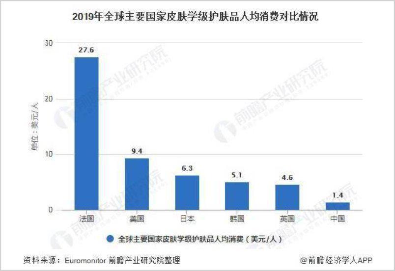 《中国皮肤性病学杂志》曾经报道称,我国35%以上女性属于敏感肌人群,意味着中国仅女性敏感肌消费者数量就超过两亿人。2019年,我国功效性护肤品渗透率仅5.5%,远低于美国的14.7%。同年,我国功效性护肤品人均消费为1.4美元/人,而日本、韩国、美国、法国、英国人均消费分别为6.3、5.1、9.4、27.6、4.6美元/人。巨大的差距,意味着巨大的提升空间。