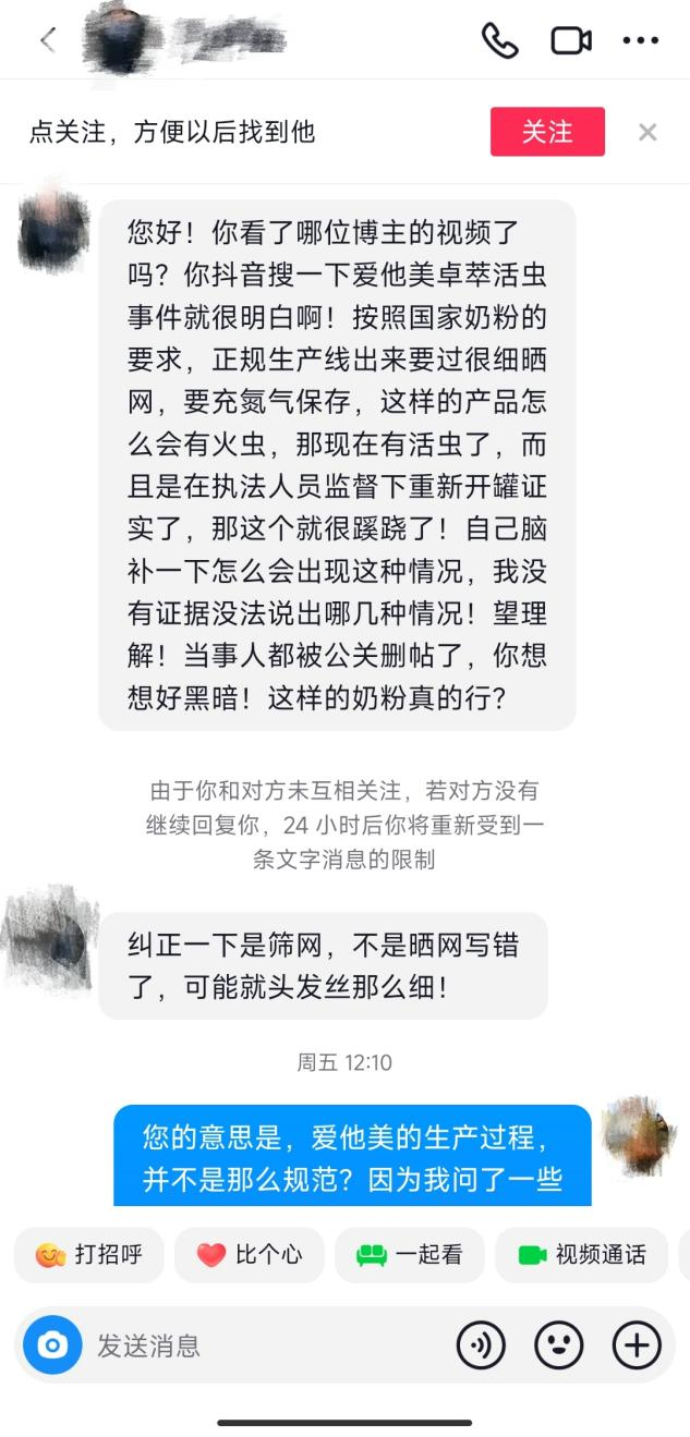 网友小雨则表示,自己买的爱他美奶粉,也发现过活虫,找到销售员后,对方告诉她,不是厂家的原因,可能是装奶粉的时候,虫子飞进去了。她表示:“现在想想,我家宝宝那段时间老拉肚子。”