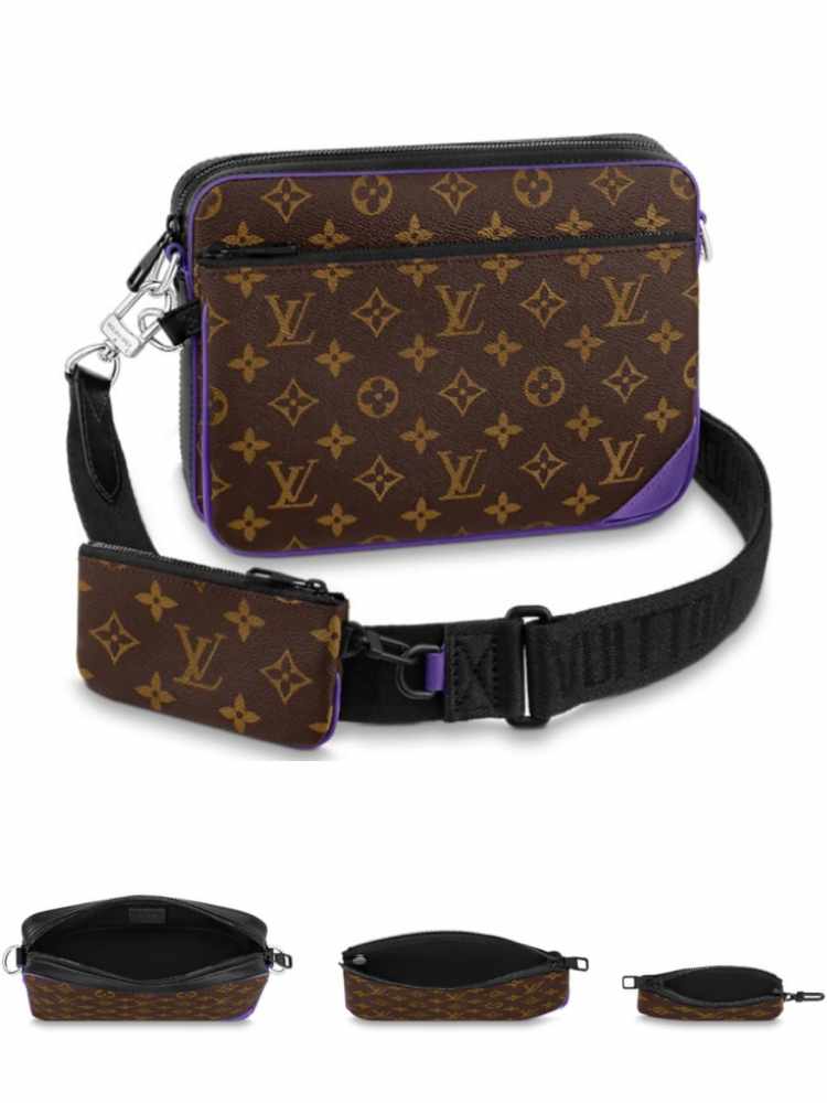 后我们要介绍LV Trio 邮差包是一款三合一的包包,可拆分拉链袋和肩带上的零钱包,可玩性很强。材质上采用Monogram Macassar帆布经典大气,借由明亮牛皮革细节追忆设计师 Virgil Abloh 的挚爱元素,为整体设计增加了趣味和潮流气息。
