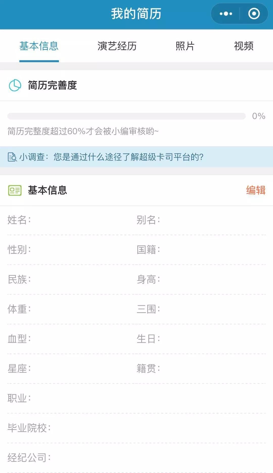 基础:基本信息首先,基础也是根本的自然就是填写基本信息了。这一点基本是通用的,因为不管从事什么职业基本信息都必不可少,做演员当然也一样。