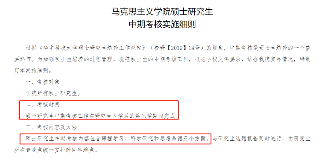 中期考核是研究生完成课程学习并在开题结束进行一定研究后、进入学位论文写作前进行的重要关口,是对研究生研究进程中取得成绩和遇到问题的一次“体检” 。以硕士研究生为例,中期考核期间多集中在研二阶段,南京大学对攻读学硕的研究生中期考核规定在硕士二年级上学期结束前完成,华中科技大学马克思主义学院硕士研究生中期考核时间在入学后第三学期内完成。